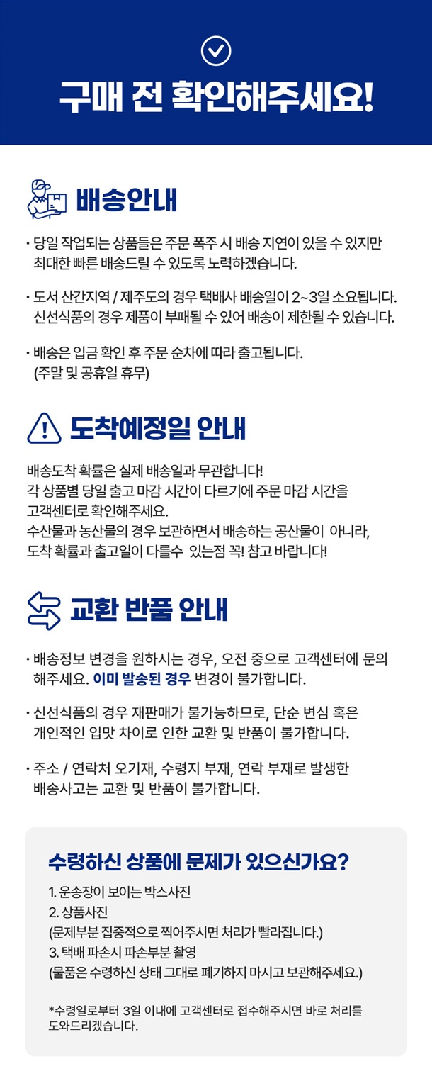 · 상품 불량 사유와 사진을 남겨 주시면 빠른 처리가 가능합니다.