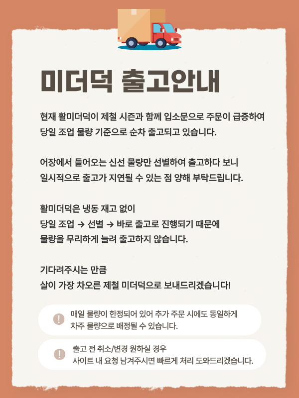· 배송은 입금확인된 날짜로부터 1~3일 소요되며 최대 7일 이내 출고됩니다. ( 공휴일, 기상악화 등 불가피한 상황에 따라 추가 지연될 수 있습니다.)